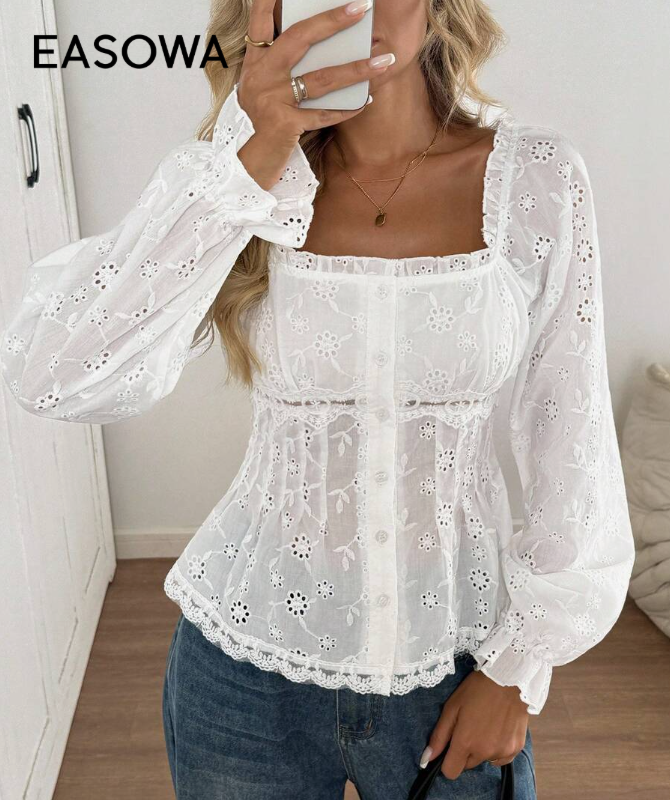 Blouse carrée col, garniture à volants, manches bouffantes