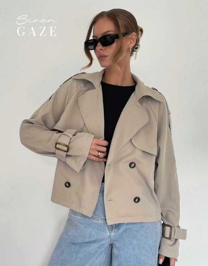 Pour celles qui trouvent les trenchs traditionnels trop formels — cette version courte se porte facilement sur un jean ou une robe. Très tendance ce printemps.